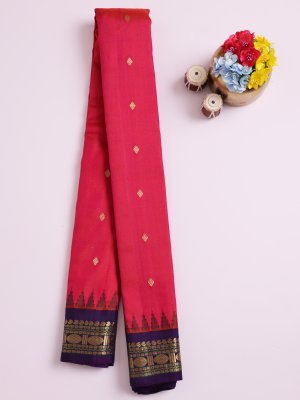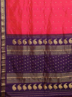 This orangish-pink Gadwal silk saree features a beautiful orangish-pink body adorned with delicate kamalam butta motifs that add a subtle traditional charm. The violet border with green seer accents and a rich zari pallu enhances its regal appeal. Woven in lightweight silk, it offers graceful draping and comfortable elegance. Perfect for festive occasions, weddings, and cultural gatherings, this saree beautifully blends classic craftsmanship with timeless style