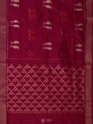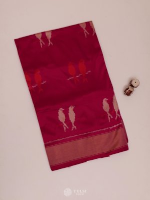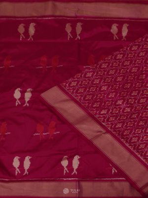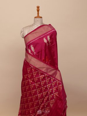 This Rani Pink Ikat Silk Saree captures the essence of traditional craftsmanship with a touch of modern charm. The saree features intricate birds Ikat patterns woven in soft ivory tones across a bright Rani Pink base, creating a stunning visual harmony. Its lustrous silk texture adds a luxurious sheen, while the subtle golden undertones enhance its festive appeal.