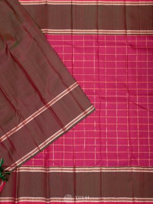 This Rani Pink Kanjeevaram Silk Saree features a vibrant pink shade with a contrasting green bodi border, blending elegance and tradition in luxurious silk.