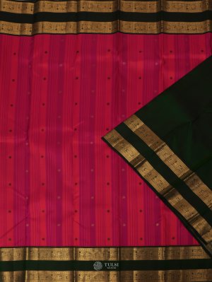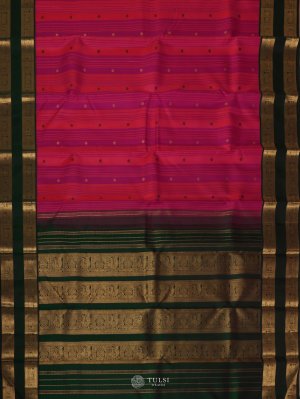 Striped Orange-Pink Kanjeevaram Silk Saree With Dark Green Border
