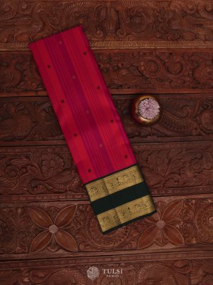 This Rani Pink Kanjeevaram Silk Saree with a rich Green Border is a perfect blend of tradition and elegance. The bright Rani Pink body is adorned with subtle woven motifs, adding charm and vibrance, while the deep Green border and pallu are highlighted with intricate golden zari work that enhances its grandeur.