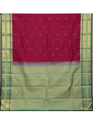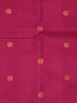 This Rani pink Kanjeevaram silk saree is elegantly framed with a light parrot green border woven in rich golden zari, featuring timeless elephant and peacock motifs. The silk body is adorned with elephant and round kamalam butties all over, lending a regal finish perfect for weddings and festive celebrations.