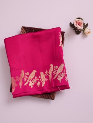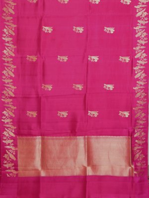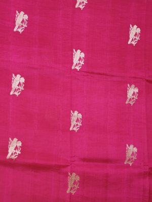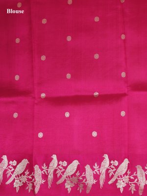 This gorgeous Mashru Silk Saree showcases a striking rani pink base adorned with intricate gold zari parrot motifs with charming floral kodi designs. The lustrous satin border is decorated with distinctive parrot and flower with leaf kodi, exuding elegance and grace. The pallu is beautifully crafted with moggu, Banaras, muthu, and solid pattern arrangements, creating a rich and timeless appeal.