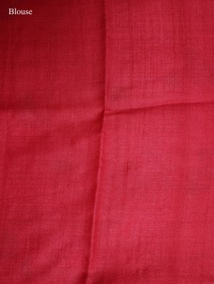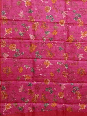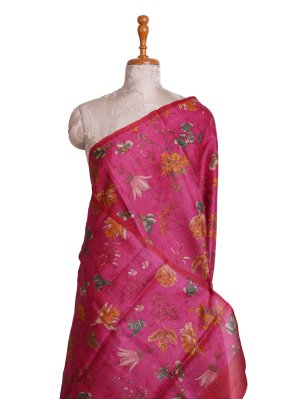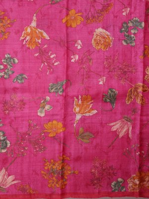 This Rani Pink Printed Tussar Silk saree features an organic matte texture adorned with vibrant mustard and olive floral prints across the entire body. The structural detail consists of a clean solid red border that provides a sharp contrast to the textured fabric and intricate botanical patterns. A matching pallu completes the drape with a simple refined finish making it an ideal choice for elegant daytime events or festive occasions.