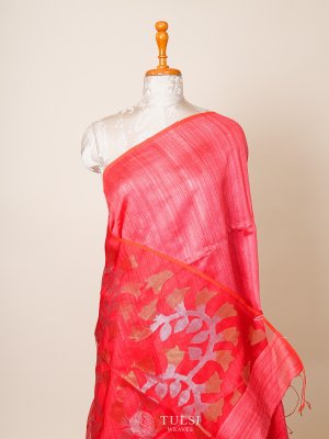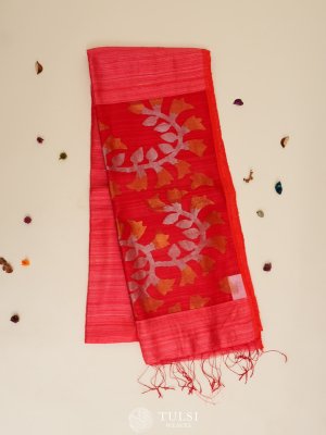 A Red bailou tussar saree is a stunning and elegant option! enhance various skin tones and can be dressed up or down for different occasions. The unique texture of Tussar silk adds a touch of sophistication, making it ideal for festive events or even weddings.
