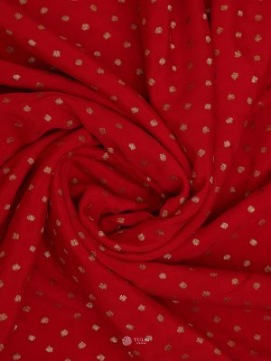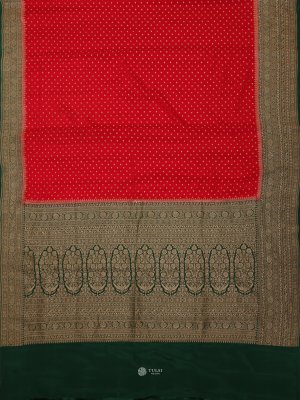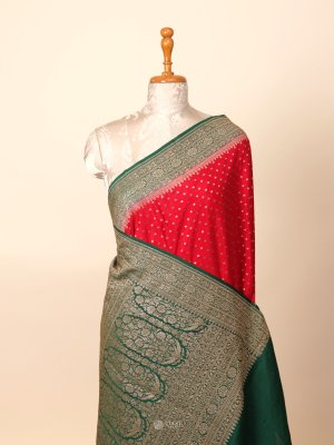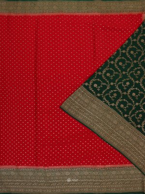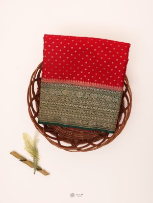 Brighten your celebration look with this stunning Red Banaras crepe saree, featuring intricate gold zari buttas and a rich Green zari-woven border and pallu. A perfect blend of vibrance and elegance for festive wear.