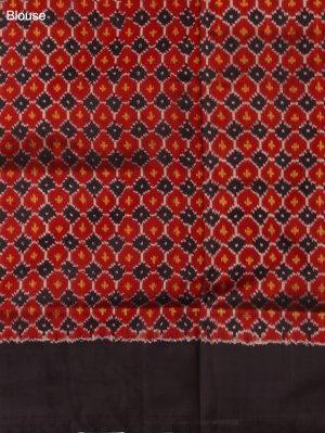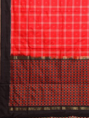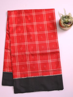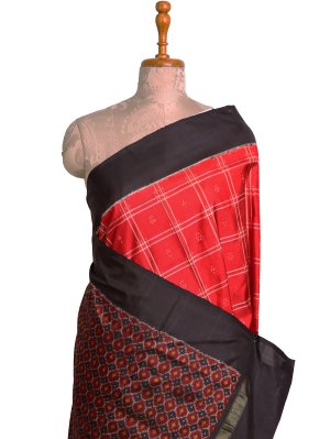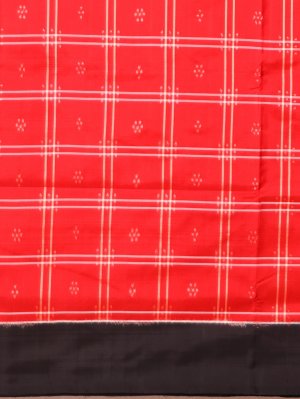 This red ikat silk saree is defined by a deep, plain black border that provides a sleek, modern frame to the vibrant body. The red canvas is detailed with a precise white check grid, where each square holds a small body pattern that enhances the overall structure. It’s a perfect harmony of bold contrasts and intricate geometric storytelling.
