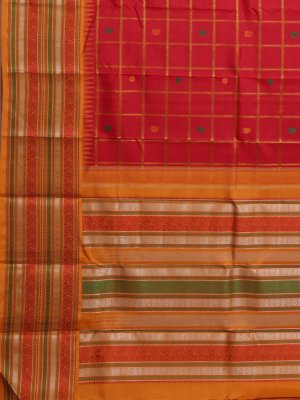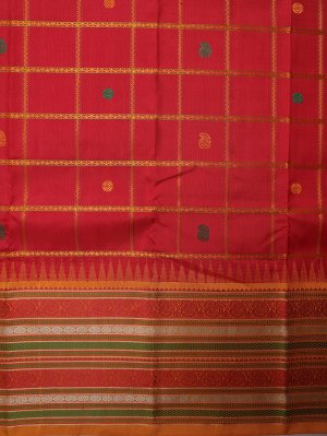 Red Checked Kanjeevaram Pattu Pettu Silk Saree With Mustard Yellow Border