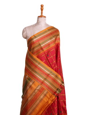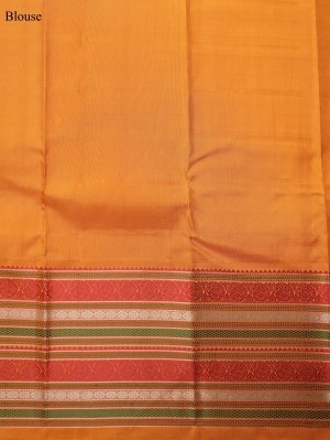 This Red Kanjeevaram silk saree showcases a geometric grid body accented by subtle mustard and green threadwork. The mustard yellow border is richly accented with harmonious tones of red, green, and mustard yellow bands of mango buttas, rudraksh, and geometric lines in pattu pettu work. The substantial, lustrous weave ensures a secure, weighted fall and a regal silhouette perfect for grand wedding celebrations.