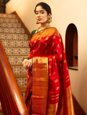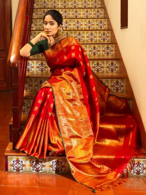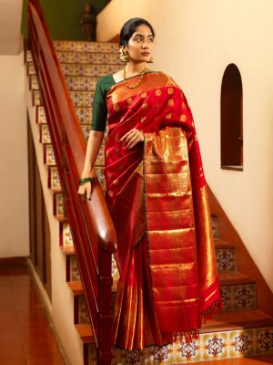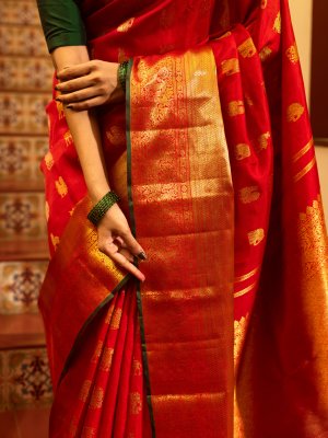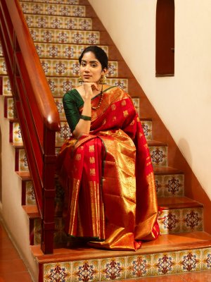 This Red Checked Kanjeevaram Silk Saree is a timeless masterpiece, exuding elegance and tradition. Woven from rich, lustrous silk, it features elegant checks in the body and has a Yellow korvai zari border enhancing its regal charm.