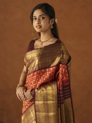This wine red-checked Kanjeevaram silk saree features a beautifully woven body with subtle checks and elegant kamalam butta motifs that enhance its traditional appeal. It is paired with a solid maroon border inspired by Thazampoo temple designs, adding a rich heritage touch. The pallu is finished with classic zari weaving that elevates its festive charm. Crafted in pure Kanjeevaram silk, this saree reflects timeless elegance and traditional craftsmanship, making it perfect for weddings and special occasions.