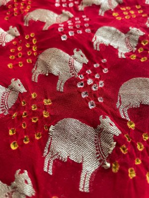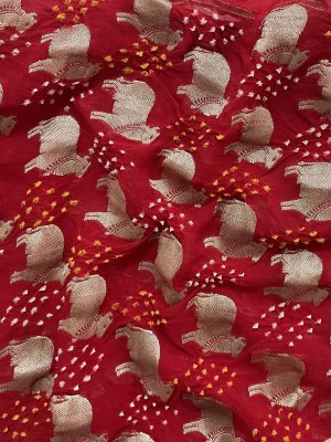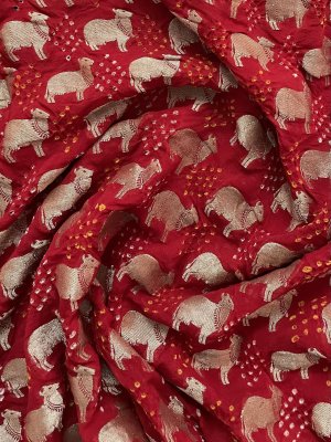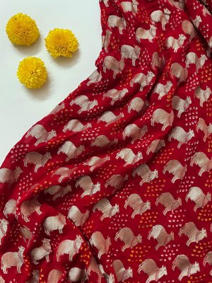 Hand-Woven Vermillion Red Georgette Silk Blouse embellished with zari cow motifs spread all over.
