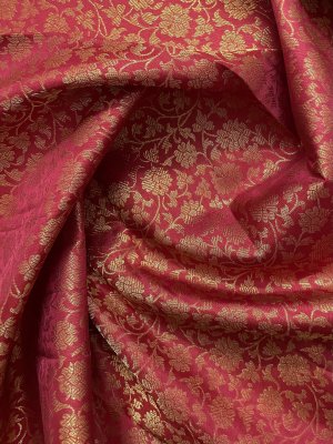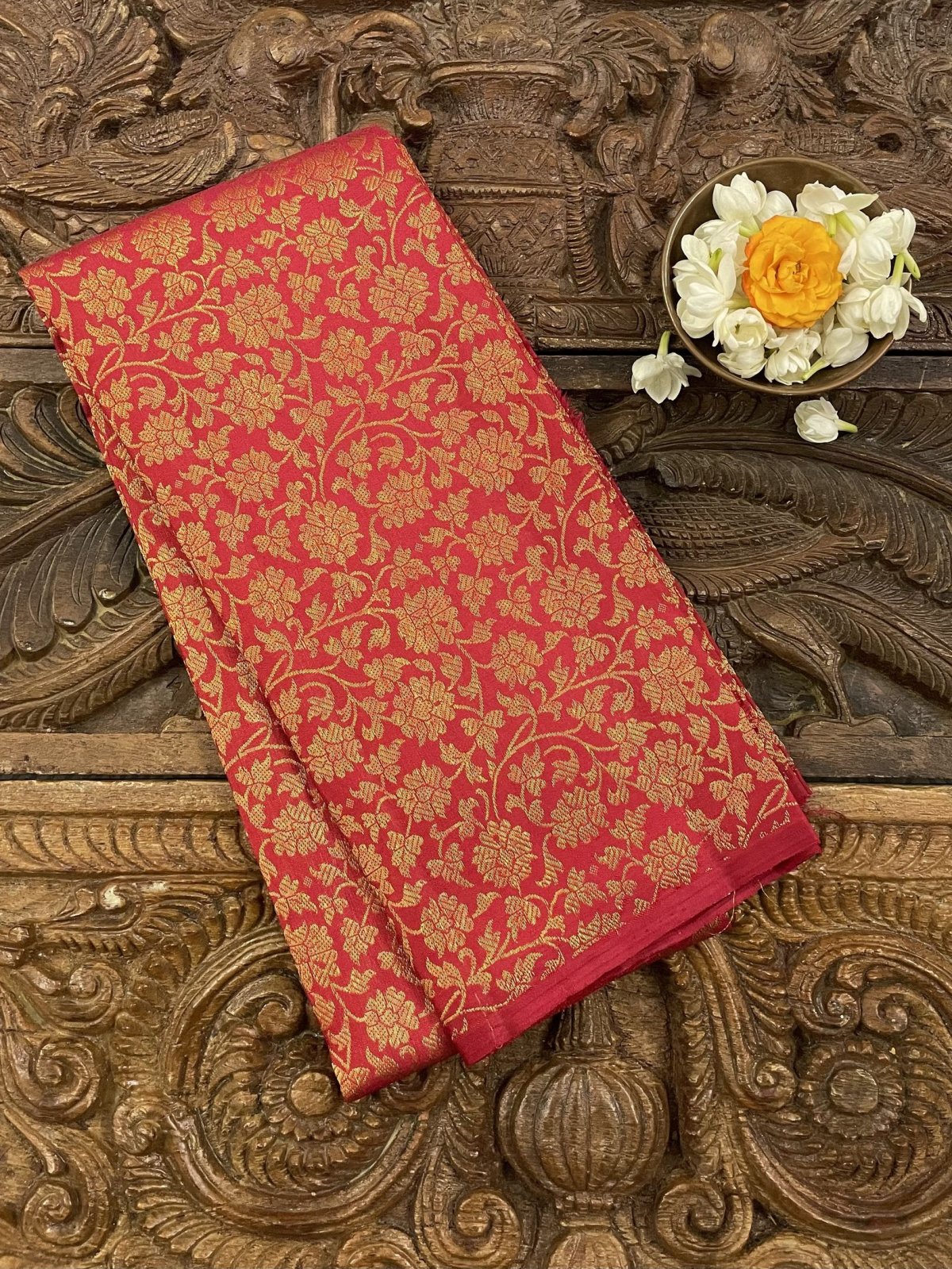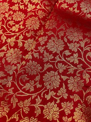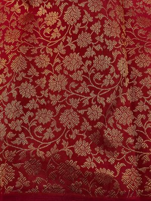 This handwoven Red Kanjeevaram silk blouse is adorned with elaborate floral gold zari brocade all over.