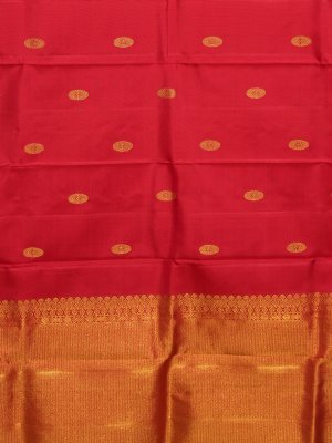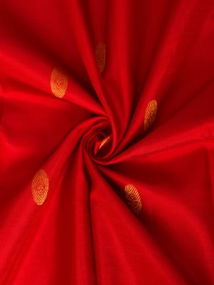 This Red Kanjeevaram Silk Dupatta features a rich scarlet body adorned with intricate golden zari Rudraksha buttas. The classic temple-inspired borders and shimmering pallu are masterfully handwoven, culminating in delicate hand-knotted tassels for a timeless, regal wedding ensemble.
