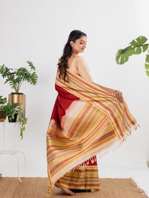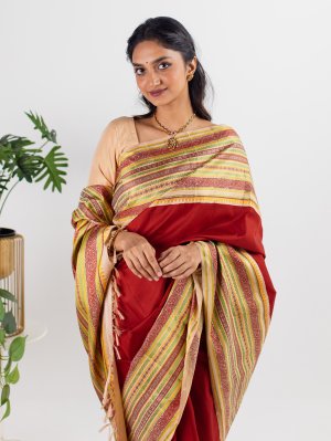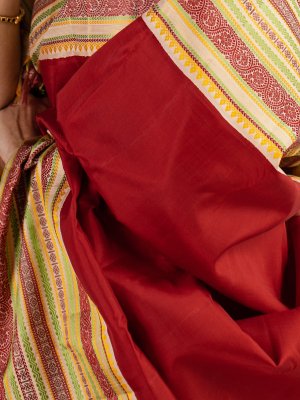 This handwoven Kanjeevaram silk saree has a red body paired with a beige pattu pettu border. The korvai border is adorned with threadwork highlights in red, green and yellow.