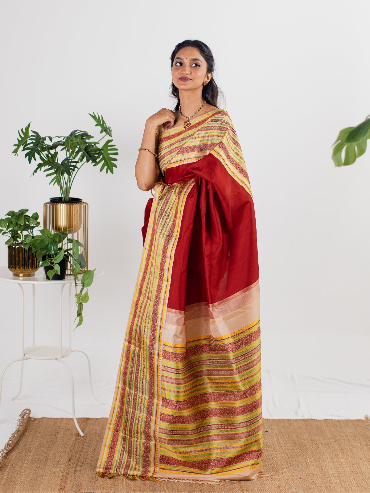 Air the saree out every 4-5 months and occasionally change its folds. Preferably keep the saree rolled. Store in a cotton bag and dry clean only.