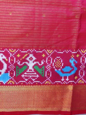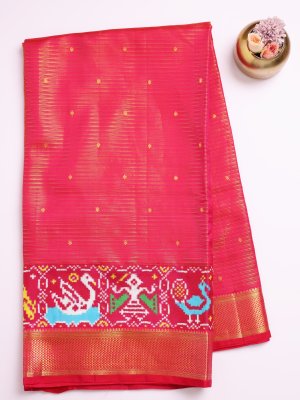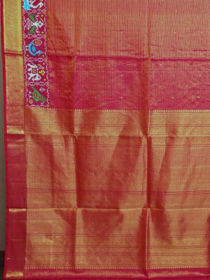 This pinkish-red Kanjeevaram silk saree features a Patan Patola border and a gold zari pallu. The Patola motifs in sky blue, green, white, and yellow depict peacocks, parrots, and elephants, showcasing traditional Patan Patola art. Made from soft silk, it drapes effortlessly for comfortable wear at weddings and festive occasions. A perfect blend of Kanjeevaram silk, vibrant colors, and artisanal craftsmanship.