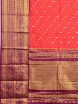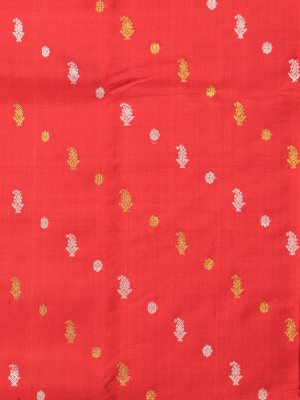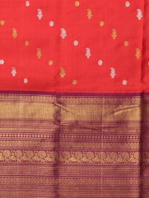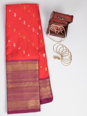 The red Kanjeevaram twill saree featuring a rich maroon border, adorned with a gleaming gold zari trim and delicate silver and gold butis scattered across the body, exudes timeless elegance and festive charm. The smooth twill weave gives the saree a graceful fall, while the shimmering butis add subtle sparkle. Perfect for weddings, festivals, and special occasions, this saree blends traditional craftsmanship with contemporary style.