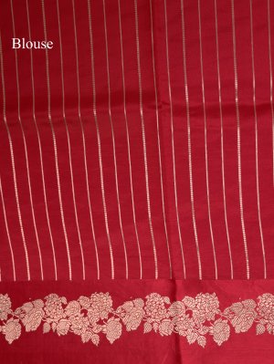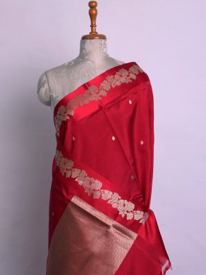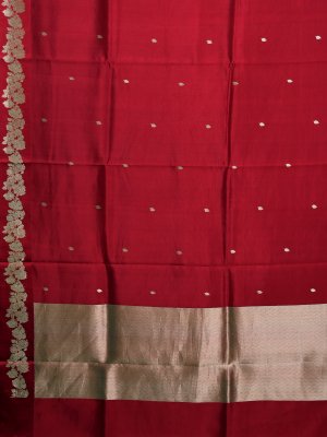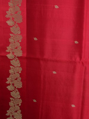 This red Mashru silk saree is a bright and beautiful choice for any celebration. It has a shiny silk finish on the outside and soft cotton on the inside, making it very comfortable to wear. The vibrant red color looks very traditional and makes the gold floral borders and tiny dots really pop. Because the fabric is high-quality and strong, it drapes perfectly and creates a very elegant look. It is a classic and royal saree, perfect for weddings or festivals.