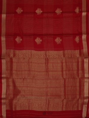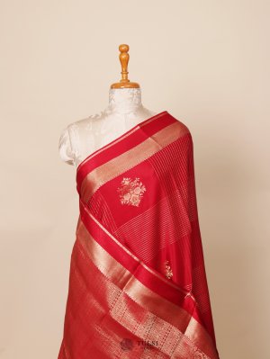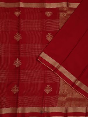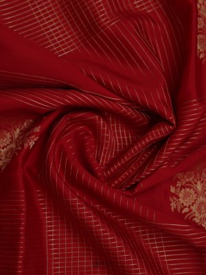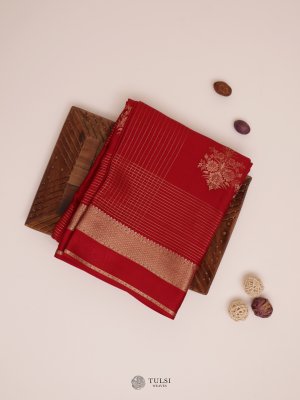 This Elegant Red Mysore Silk Saree features delicate zari lines across the body, offering a soft sheen and timeless charm. Perfect for understated festive wear and sophisticated gatherings.