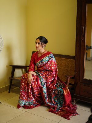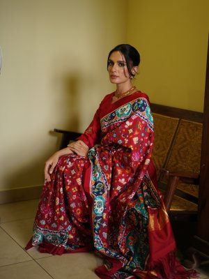 This Red Patan Patola Silk Saree is a timeless piece of heritage weaving, showcasing the intricate double ikat craftsmanship that Patola is renowned for. The rich red base is adorned with vibrant multicolored motifs, carefully handwoven to perfection, reflecting symmetry and precision on both sides of the fabric. A striking contrast border with traditional geometric and floral designs enhances its regal appeal, while the pallu adds depth with bold hues and intricate patterns.