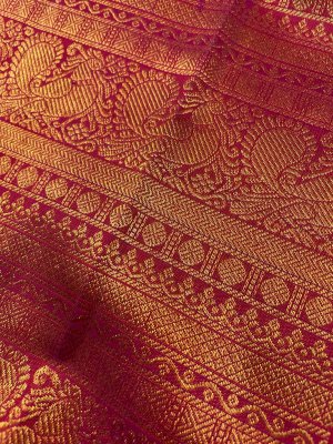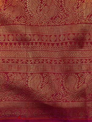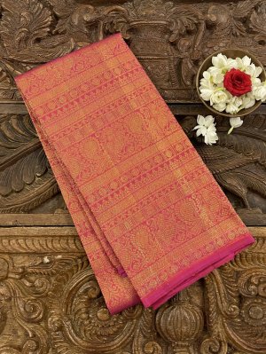 This handwoven reddish-pink Kanjeevaram silk blouse is adorned with elaborate gold zari peacock motif detailing all over.