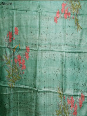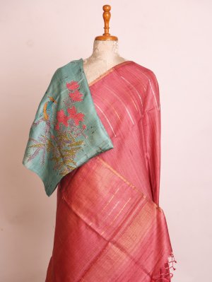 This reddish-pink Tussar silk saree features elegant zari work and vibrant Kantha-embroidered floral motifs in mahndi green, sky blue, blue, and dark rose. The bluish green batik-printed blouse complements the embroidery beautifully. Each flower is thoughtfully crafted, adding charm and artistry. Lightweight and soft, the saree drapes effortlessly for comfortable, graceful wear.