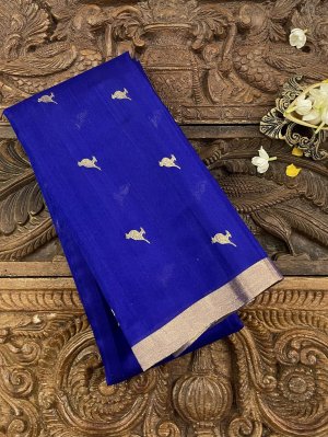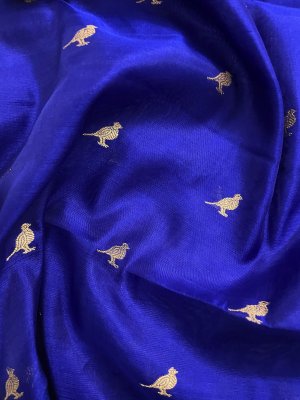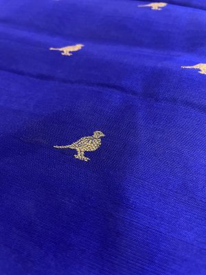 This Handwoven Royal Blue Chanderi Silk Blouse is embellished with gold and silver zari bird motifs accompanied by silver borders.