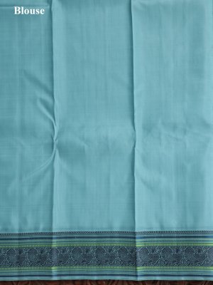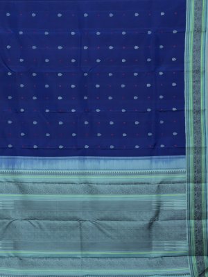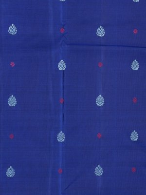 This royal blue Kanjeevaram pattu pettu silk saree features delicate powder blue and pink buttas woven across the body for a refined contrast. The powder blue border is richly accented with harmonious tones of blue, mehndi green, and green pattu pettu work. Finished with a beautifully coordinated pallu, this saree exudes timeless elegance and festive charm.