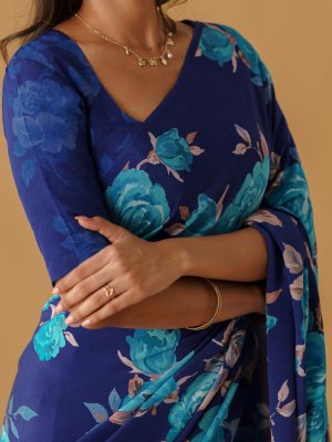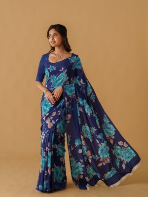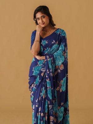 This royal blue printed crepe silk saree features an elegant floral pattern in a beautiful mix of sky blue, royal blue, brown, white, dusty pink, black, and blue. The delicately arranged motifs enhance the richness of the base color, creating a refined and timeless appeal. Crafted from lightweight crepe silk, it drapes effortlessly, making it an ideal choice for those who appreciate classic elegance and understated sophistication.