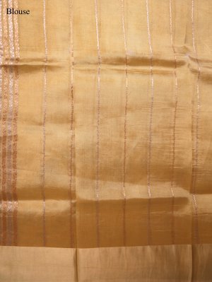 This Royal Yellow Tussar Silk saree features a smooth body decorated with organic eco-printed leaf patterns for a unique, nature-inspired look. The self-toned satin border is defined by lustrous peacock motifs in gold zari and silver zari, providing a polished frame to the rustic prints. A coordinated pallu with sleek metallic vertical stripes ensures a refined finish, making it a distinctive choice for grand celebrations.