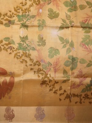 To retain the beauty of your saree, air it out every 4-5 months and occasionally change its folds. Preferably keep the saree rolled. Store in a cotton bag, be cautious of stacking it under heavy clothes and keep away from naphthalene balls. Dry clean only.