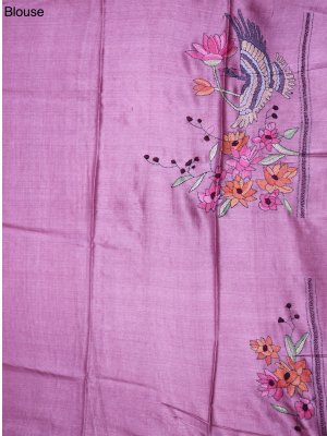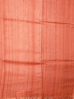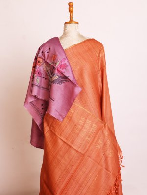 This rust-orange Tussar silk saree exudes timeless elegance, with its body subtly enhanced by delicate zari work. The Kantha embroidery of birds and flowers in shades of rose, red, maroon, light green, white, and orange adds vibrant charm and intricate detail. Paired with a pale magenta blouse, the ensemble is both visually striking and harmonious. Lightweight and breathable, the saree offers exceptional comfort and wearability, making it perfect for festive occasions or elegant gatherings.