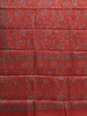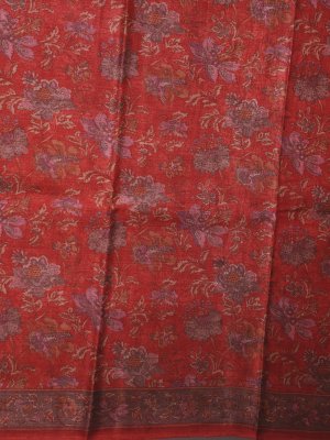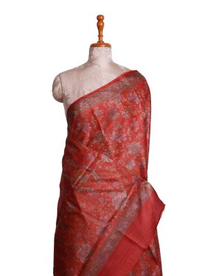 This Rust Red Printed Tussar Silk saree features a dense all-over floral pattern across the textured body which offers a distinctively natural and matte finish. The border is detailed with a structured geometric arrangement in deep earthy tones to provide a clean and polished frame. A concentrated display of floral motifs flows through the pallu to create a cohesive and graceful appearance suitable for professional or formal settings.