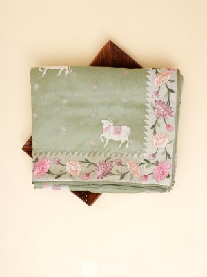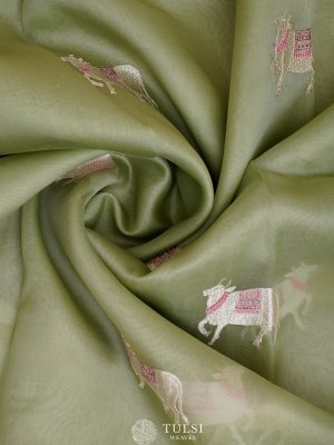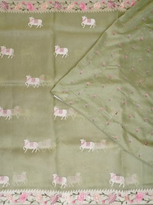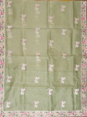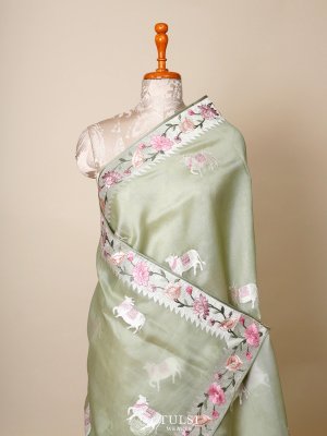 This exquisite Sage Green Organza Saree features delicate embroidery along the border and intricate embroidery work on the body and border. The shimmering organza fabric beautifully highlights the detailed craftsmanship.