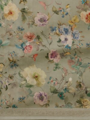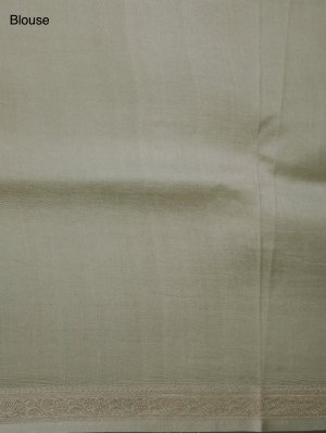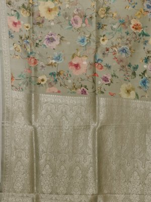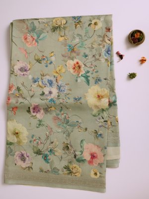 A graceful sage-green Tussar georgette silk saree adorned with delicate floral patterns spread elegantly across the body. The soft, flowy fabric enhances its airy charm and refined appeal. It is beautifully complemented by a rich zari-woven border and pallu, adding a touch of timeless opulence. Perfect for occasions that call for subtle sophistication with a hint of grandeur.