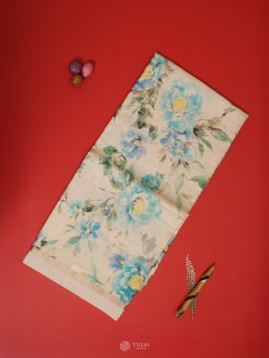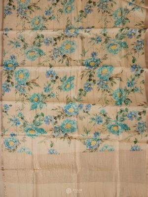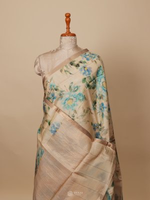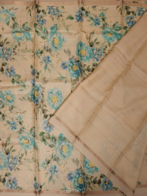 This Sandal Tussar Silk Saree features delicate floral prints that add a touch of charm. With its soft texture and natural sheen, it's perfect for both casual elegance and special occasions.