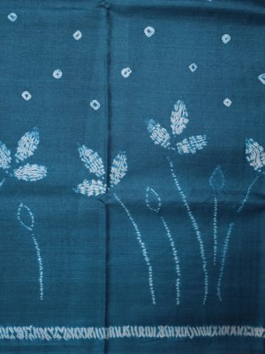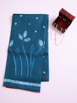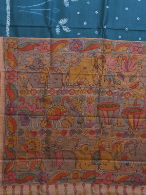 This Sea Blue Printed Tussar Silk saree features an elegant blend of traditional Bandhini dots and artistic Shibori tie-dye work across the body. The contrasting pallu showcases intricate Kalamkari prints depicting majestic elephants, graceful deer, blooming lotuses, and traditional tabla musical instruments. Complete with a matching Kalamkari print blouse, this handcrafted piece offers a unique storytelling charm through its rich cultural motifs and fluid silk drape.