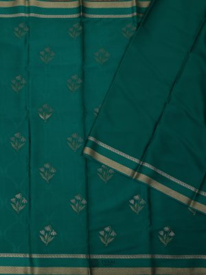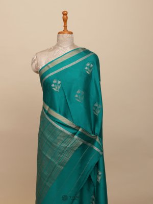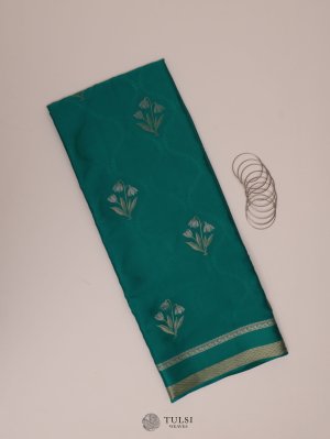 This stunning Sea Green Mysore Silk Saree radiates elegance with its rich, lustrous hue. Paired with a sophisticated self-border and floral buttas, this saree exemplifies the timeless charm and refined simplicity of Mysore silk, making it a perfect choice for any elegant occasion.