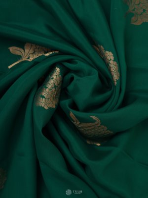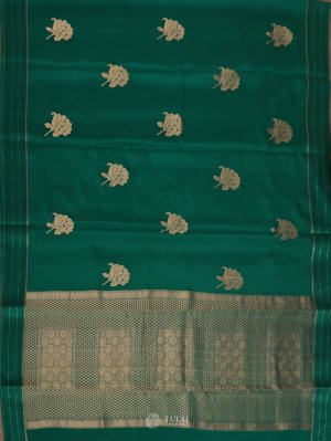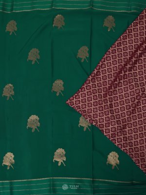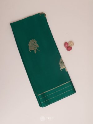 This Sea Green Mysore Silk Saree is a true classic with its lustrous finish and graceful drape. The rich golden zari motifs and border enhance its regal appeal, while the contrasting Banaras Georgette blouse in purple with intricate weaving adds a touch of contemporary sophistication.