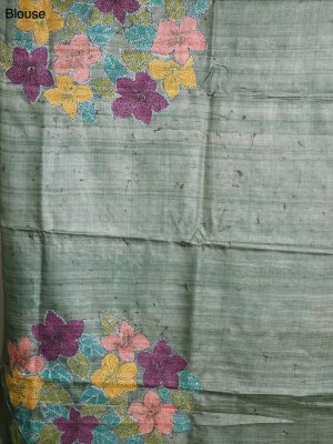 This blue Tussar silk saree features elegant zari work and a soft, flowing texture for ultimate comfort and wearability. Kantha embroidery brings vibrant floral motifs in mahandi green, sky blue, orange, and yellow to life across the body. The green blouse with batik print complements the saree, blending tradition with contemporary style. Every detail, from colors to embroidery, reflects thoughtful craftsmanship and timeless elegance.