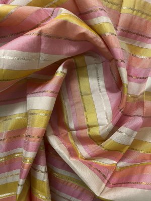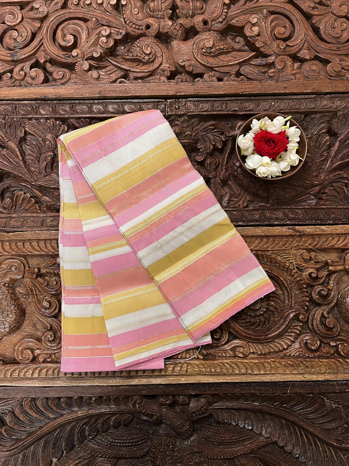 This handwoven multicolour kanjeevaram silk blouse has stripes in shades of pink, light pink, peach and yellow with veldhari in pure gold and silver zari.