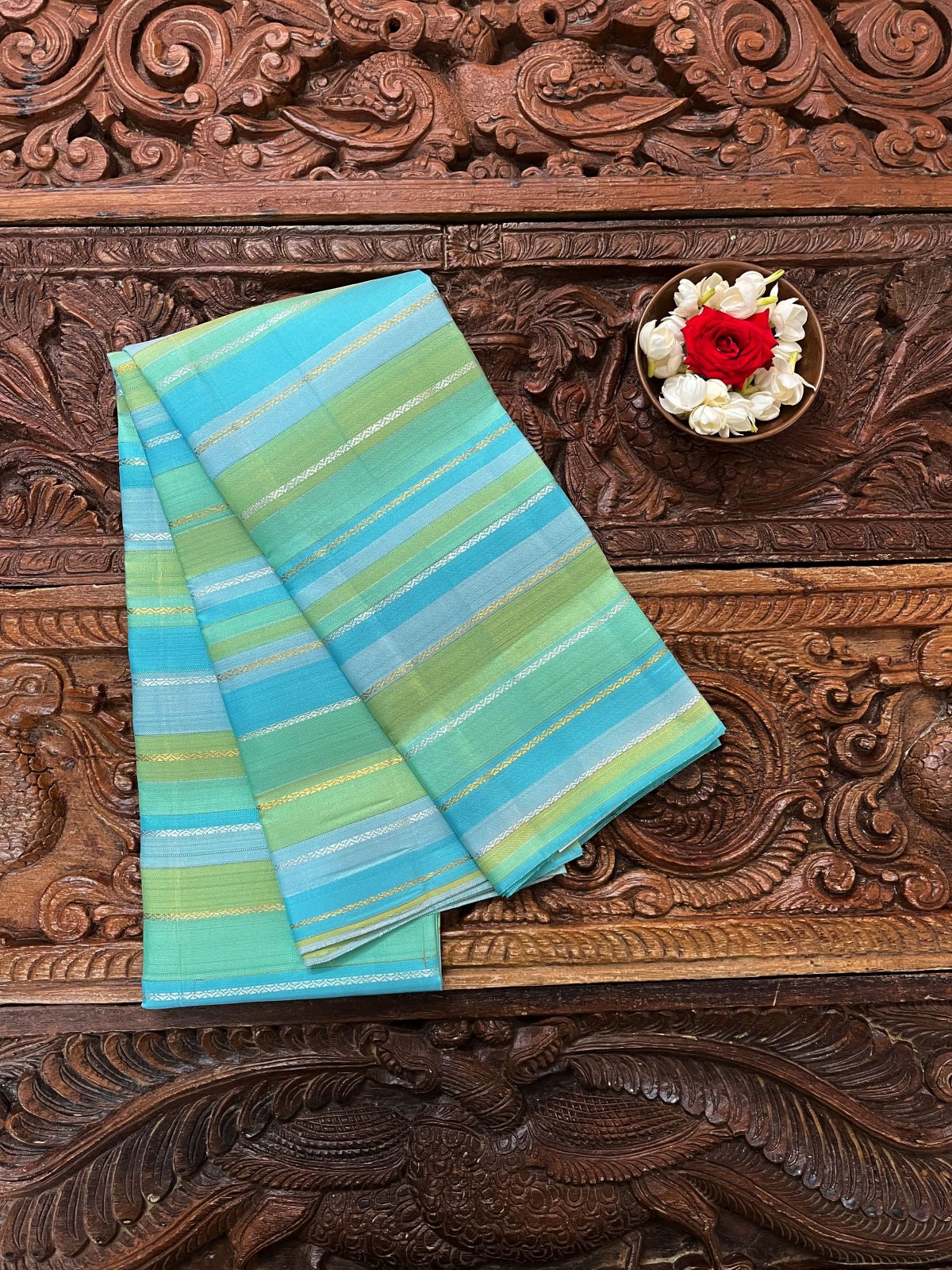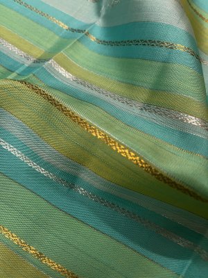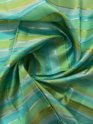 This handwoven multicolour kanjeevaram silk blouse has stripes in shades of green and blue. Veldhari stripes in pure gold and silver zari run all over.