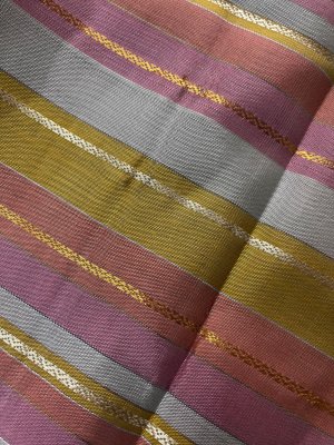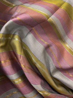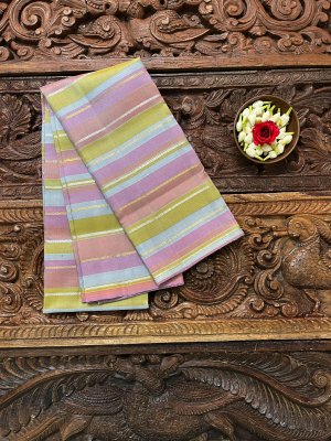 This handwoven multicolour kanjeevaram silk blouse has stripes in shades of pink, light pink, peach and yellow with veldhari in pure gold and silver zari.