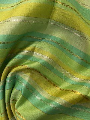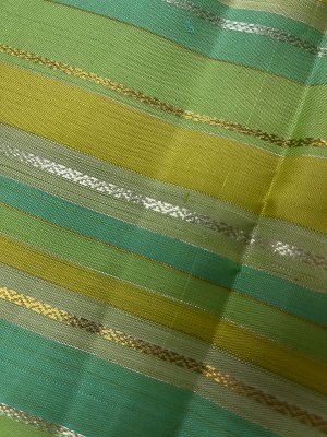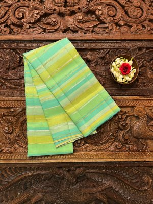 This handwoven multicolour kanjeevaram silk blouse has stripes in fresh pastel shades of pista-green, mint-green and yellow. Gold and silver zari veldhari are woven all over.