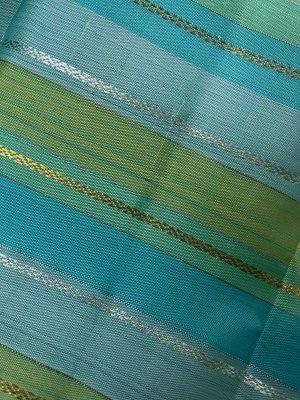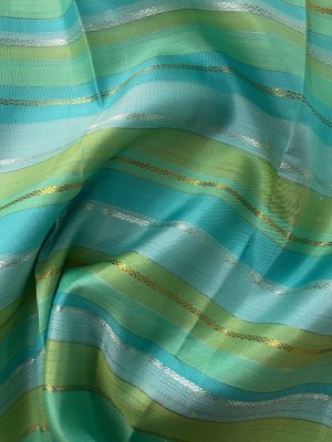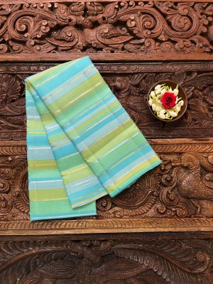 This handwoven multicolour kanjeevaram silk blouse has stripes in cool tones of blue and green. Gold and silver zari veldhari are woven all over.