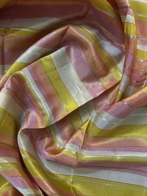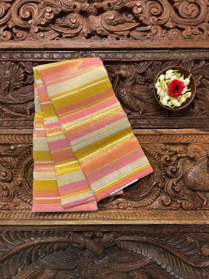 This handwoven multicolour kanjeevaram silk blouse has stripes in vibrant shades of pink, yellow, peach and off-white and is woven with gold zari tissue. Gold and silver zari veldhari are woven all over.