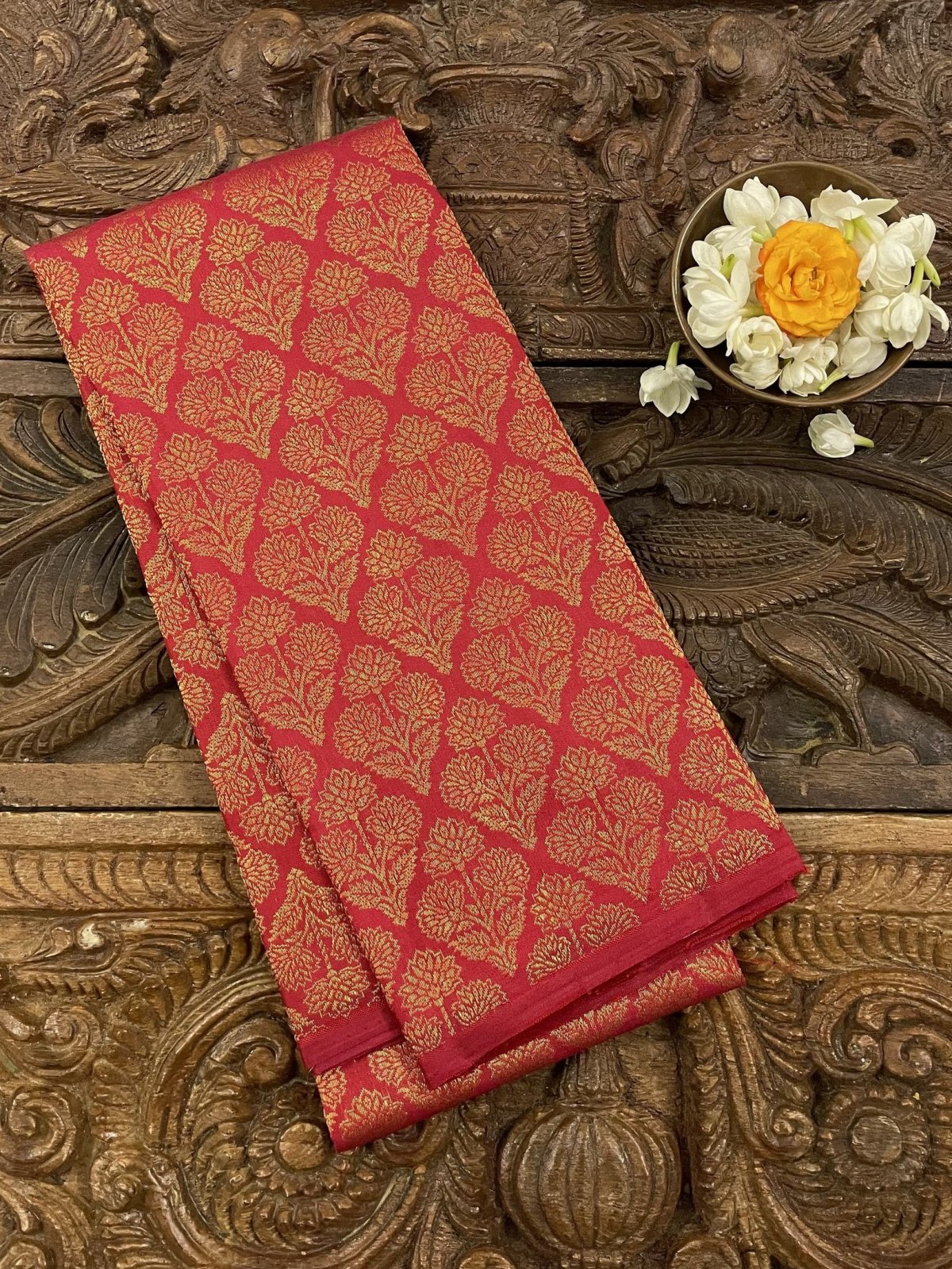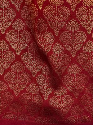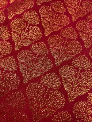 This handwoven Red Kanjeevaram silk blouse is adorned with elaborate floral gold zari brocade all over.