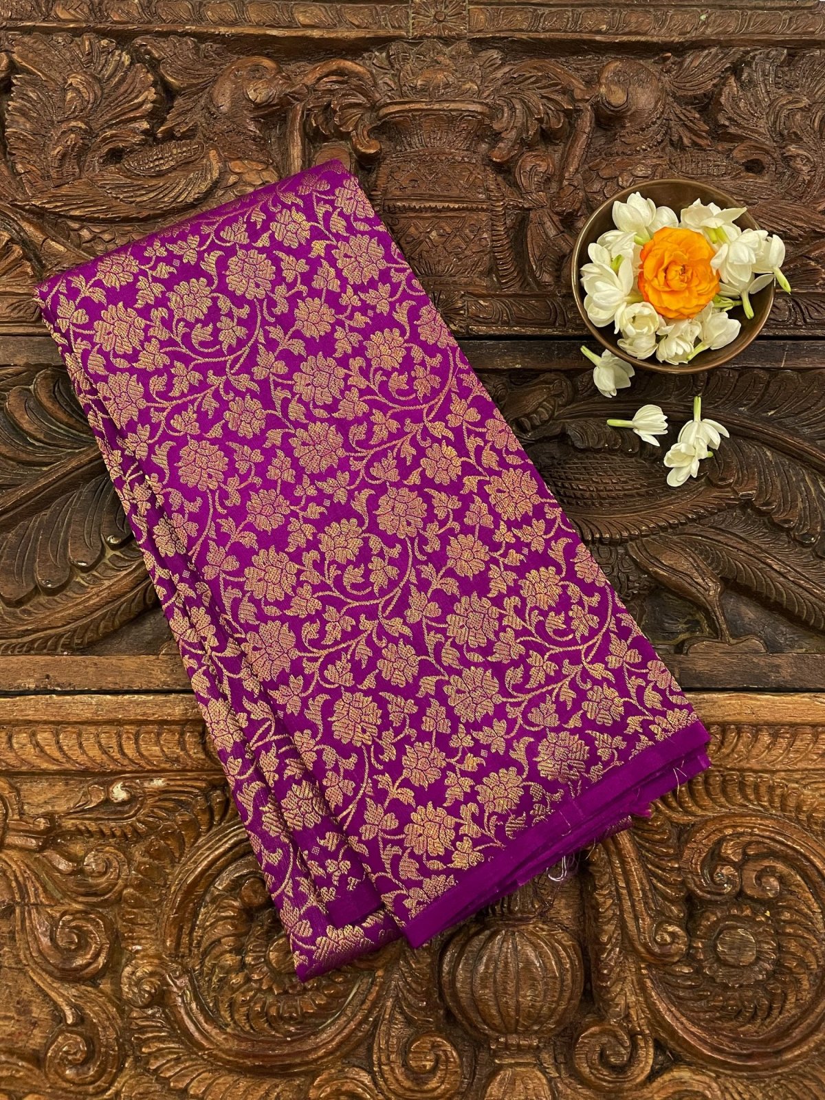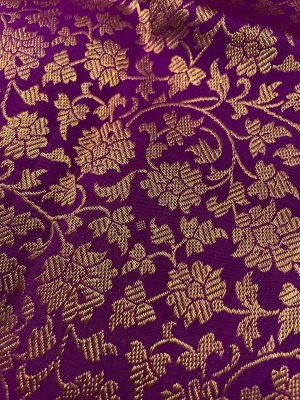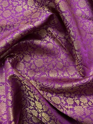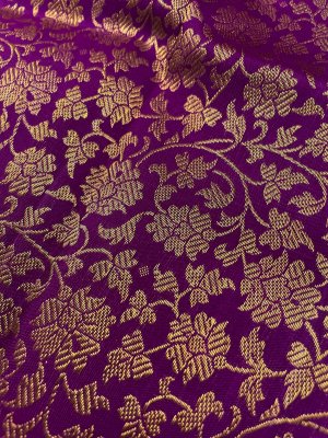 This handwoven purple Kanjeevaram silk blouse is adorned with elaborate floral gold zari brocade all over.