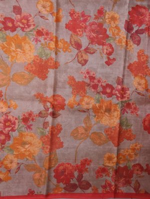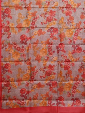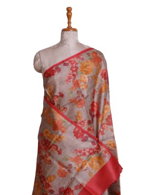 This Tan Brown Tussar Silk saree features a rich earthy body accented with dense floral prints in warm red and orange tones. The silhouette is defined by a striking red border that adds a structured frame to the textured silk fabric. A coordinating pallu with a simple refined finish ensures a cohesive look that transitions perfectly from professional settings to evening celebrations.